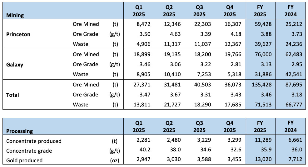 - mined 135,428 tonnes of ore from its Galaxy and Princeton ore bodies, with an average grade of 3.46 g/t in FY 2025 compared to 87,695 tonnes at 3.18 g/t in FY 2024, an increase of 54% in ore tonnes mined year on year at a 9% higher grade;